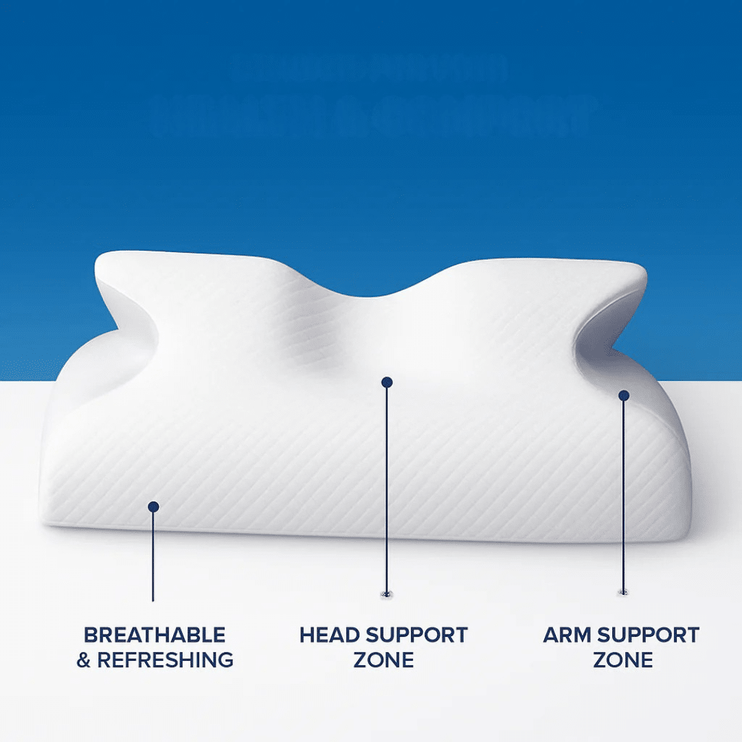 - Place your shoulder at the edge of the pillow, allowing your head to rest in the contour.